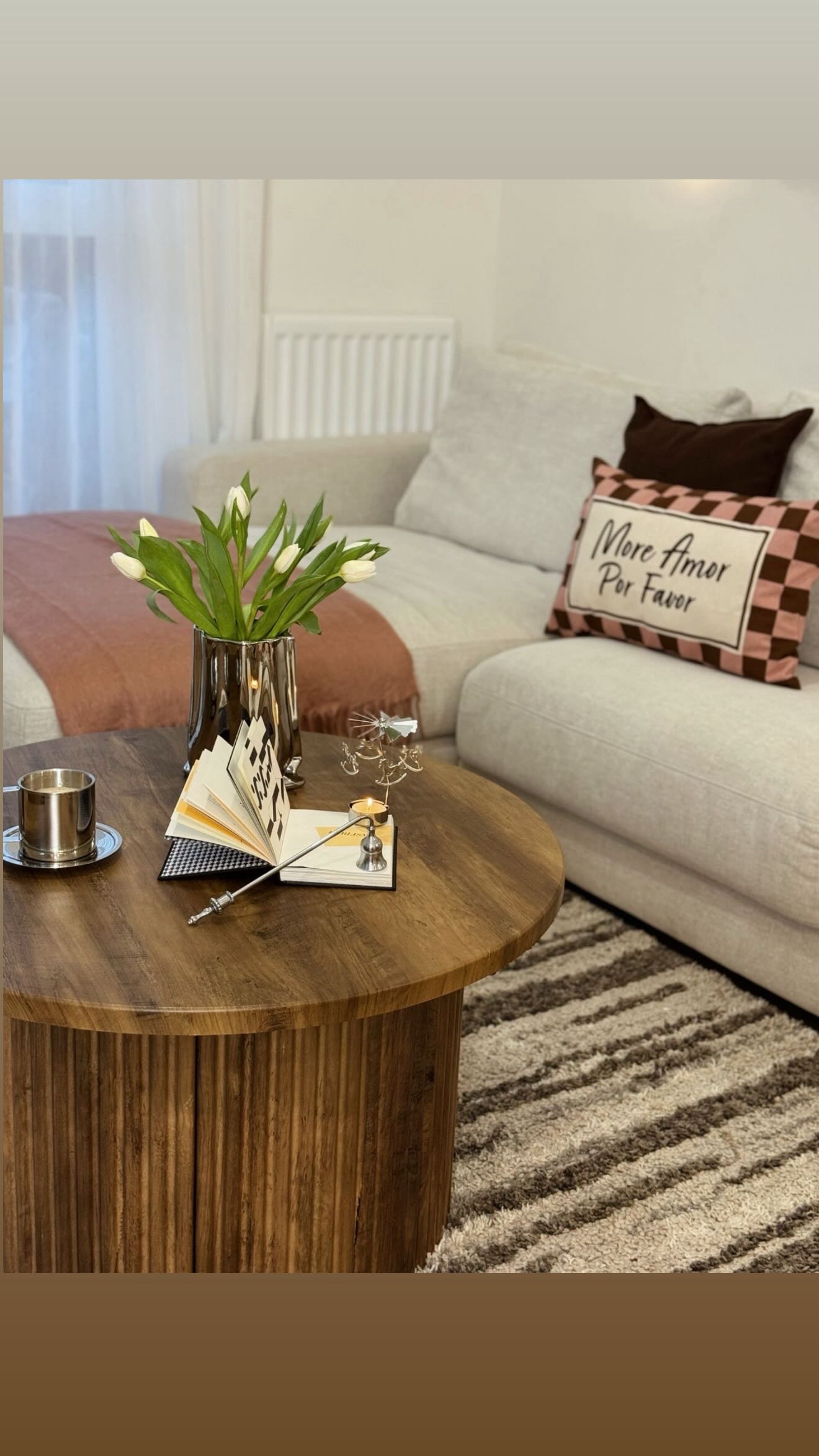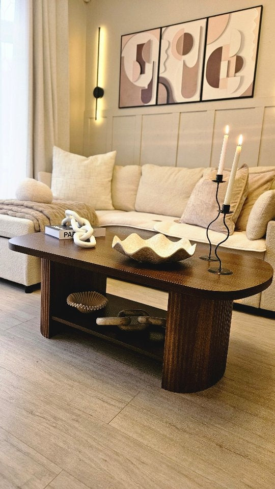Round Coffee Table, Solid Wood Center Table with Curved Base & Easy Assembly